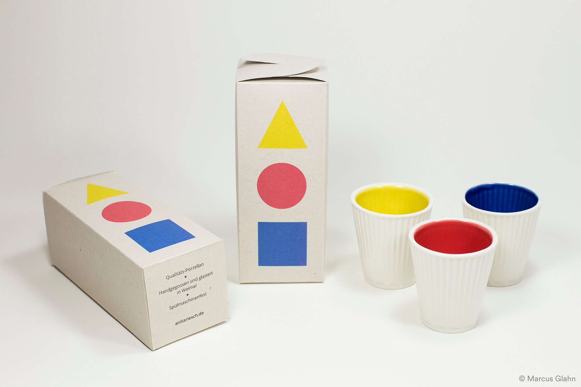 Jeder Becher besteht aus hand-gegossenem Porzellan. Die Außenseite ist transparent glasiert, die Innenseite leuchtet in den Farben rot, blau oder gelb. Die Verpackung besteht aus recyceltem Karton und ist ebenfalls handgemacht.
